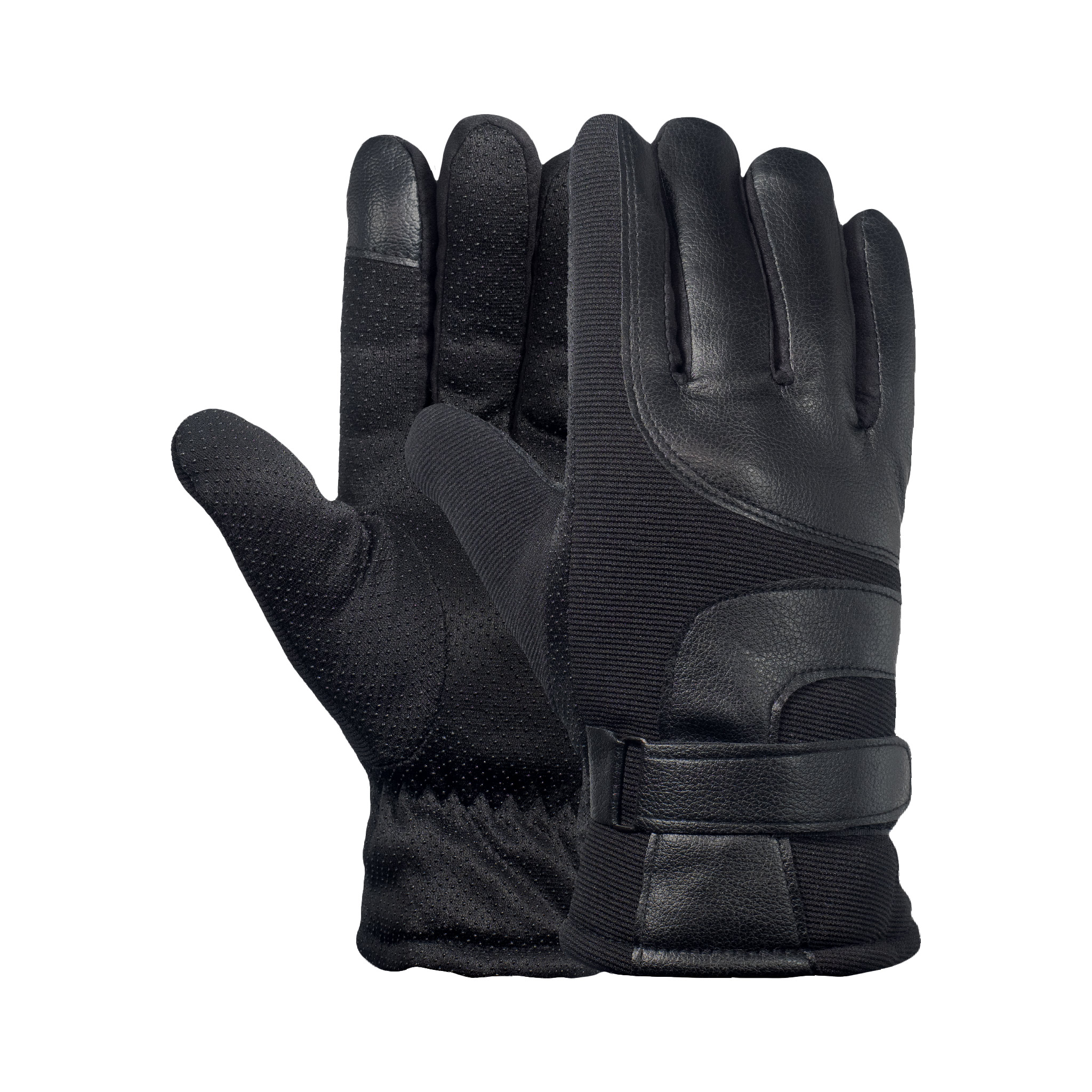 Ένα ζεστό και μαλακό ζευγάρι γάντια από δερματίνη, με γούνινη εσωτερική επένδυση. Διαθέτουν στη μέσα άκρη του δείκτη δερματίνη, ελαστικό τμήμα στην πάνω πλευρά και ανάγλυφη χούφτα. Υπάρχει λουράκι με κούμπωμα velcro για να προσαρμόζονται στον καρπό και λάστιχο για να παραμένουν στη θέση τους. Διατίθενται σε μαύρο χρώμα και μέγεθος one size. Κατάλληλα για όλους τους άνδρες που θέλουν να χρησιμοποιήσουν το κινητό τους, χωρίς να χρειαστεί να βγάλουν τα γάντια τους. Ιδανικά για τις κρύες καιρικές συνθήκες και για όλες τις εξωτερικές δραστηριότητες, αθλητικές και μη.